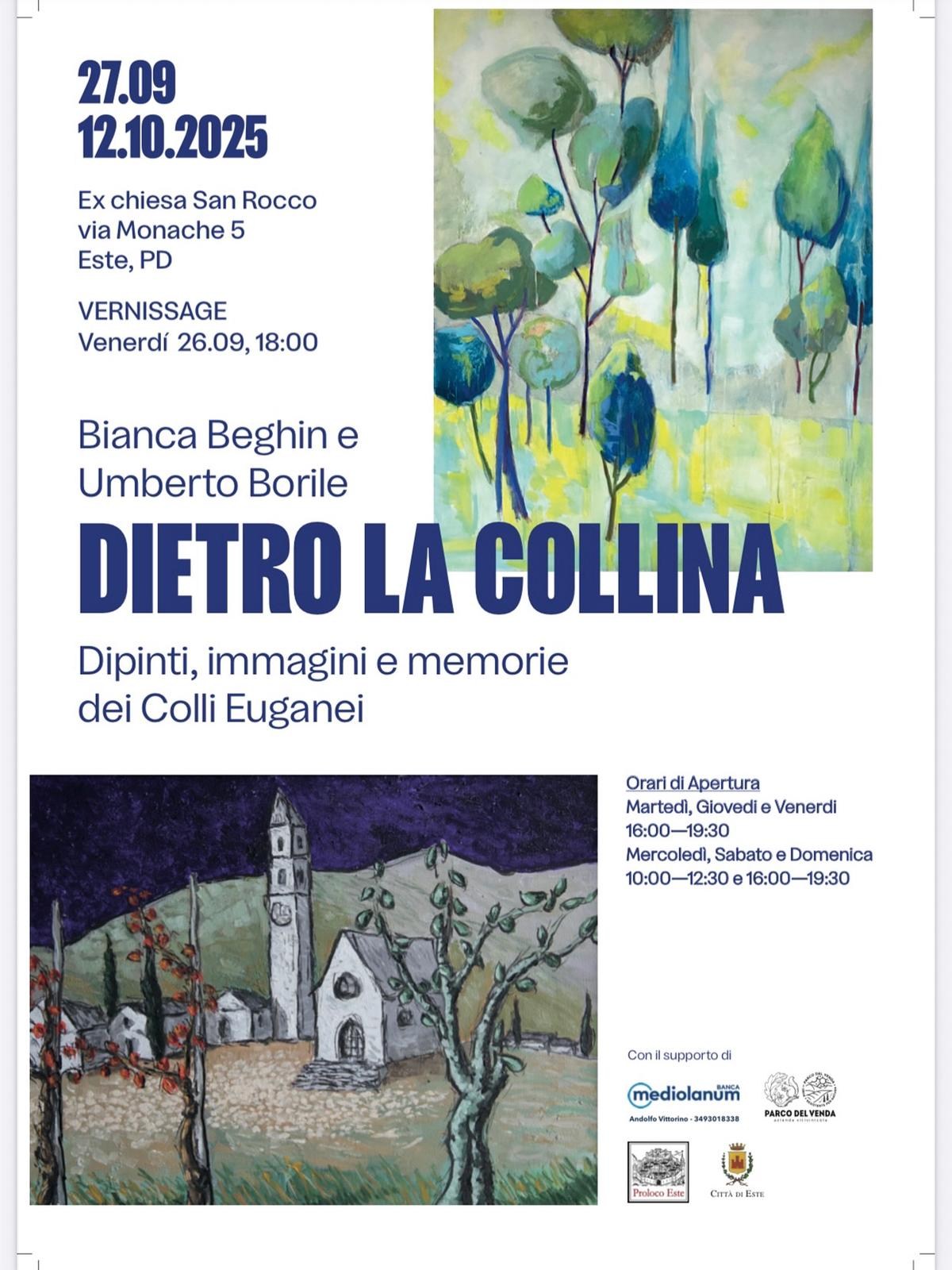 Così Lisa Celeghin descrive la nuova mostra Dietro la collina. Dipinti, immagini e memorie dei Colli Euganei di Bianca Beghin e Umberto Borile, ospitata presso la chiesetta di San Rocco dal 27 settembre al 12 ottobre 2025, negli orari indicati in locandina: